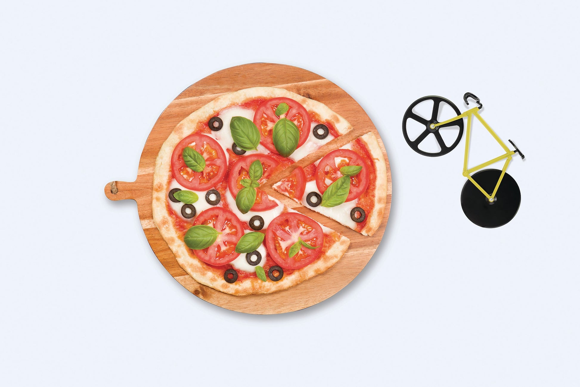 Einzigartiger Pizzaschneider in Form eines Fixie-Fahrrads. Sein Doppelschneidradsystem erleichtert das Schneiden Ihrer Pizza erheblich. Im Lieferumfang ist ein Ständer enthalten, mit dem Sie dieses originelle Objekt in ein dekoratives Stück in Ihrer Küche verwandeln können.