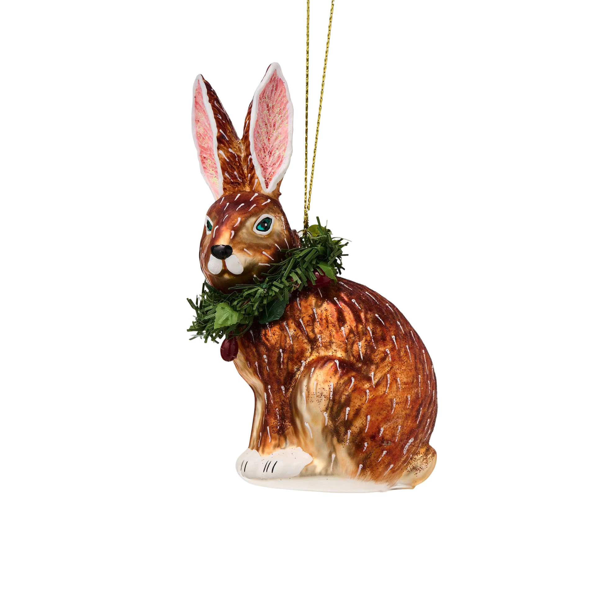 Apportez une touche de nature et de douceur à votre sapin avec ce lapin en verre soufflé à la main, orné d’une charmante couronne de verdure et de petites baies rouges.
