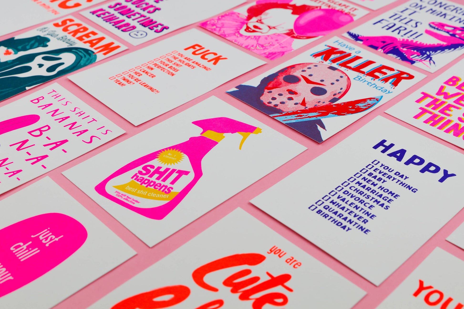 Quand la vie ne se passe pas comme prévu… envoyez un peu d’humour avec cette carte postale “Shit Happens” ! Inspirée des emballages de produits ménagers, cette création audacieuse et colorée de Studio Inktvis met en scène un flacon de spray rose fluo avec le slogan ironique “Best Shit Cleaner – You will feel better, 100% effective”.